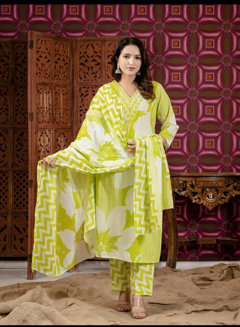 Vibrant Lime Green and White Hand block Floral Straight Suit Set with Soft cotton Dupatta