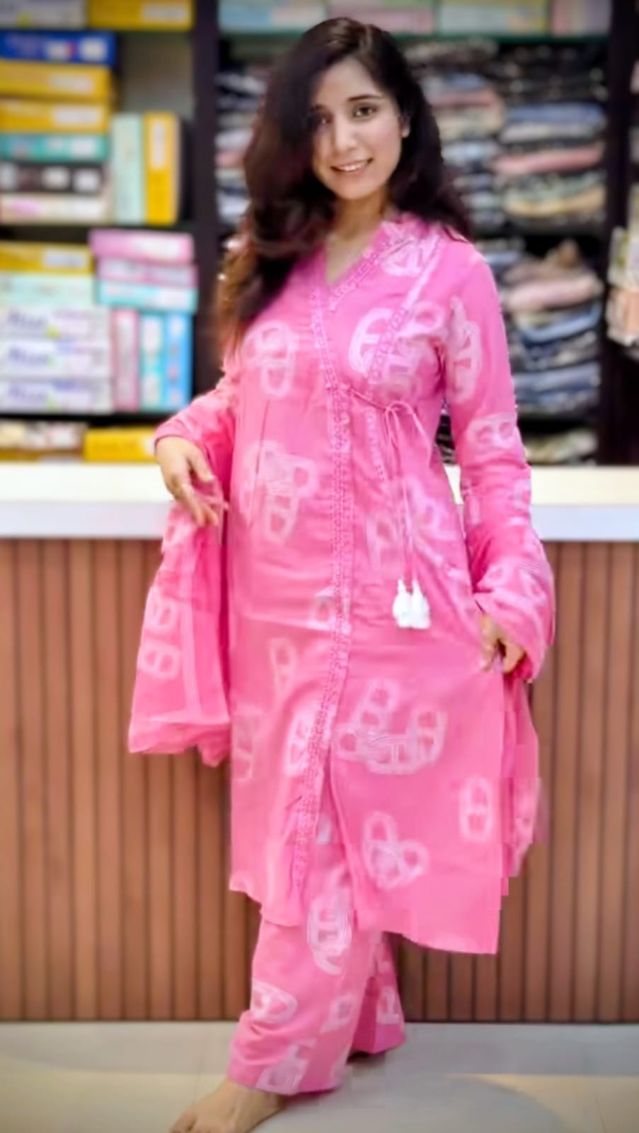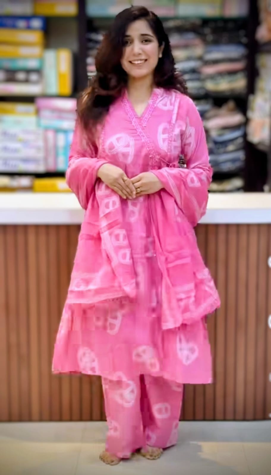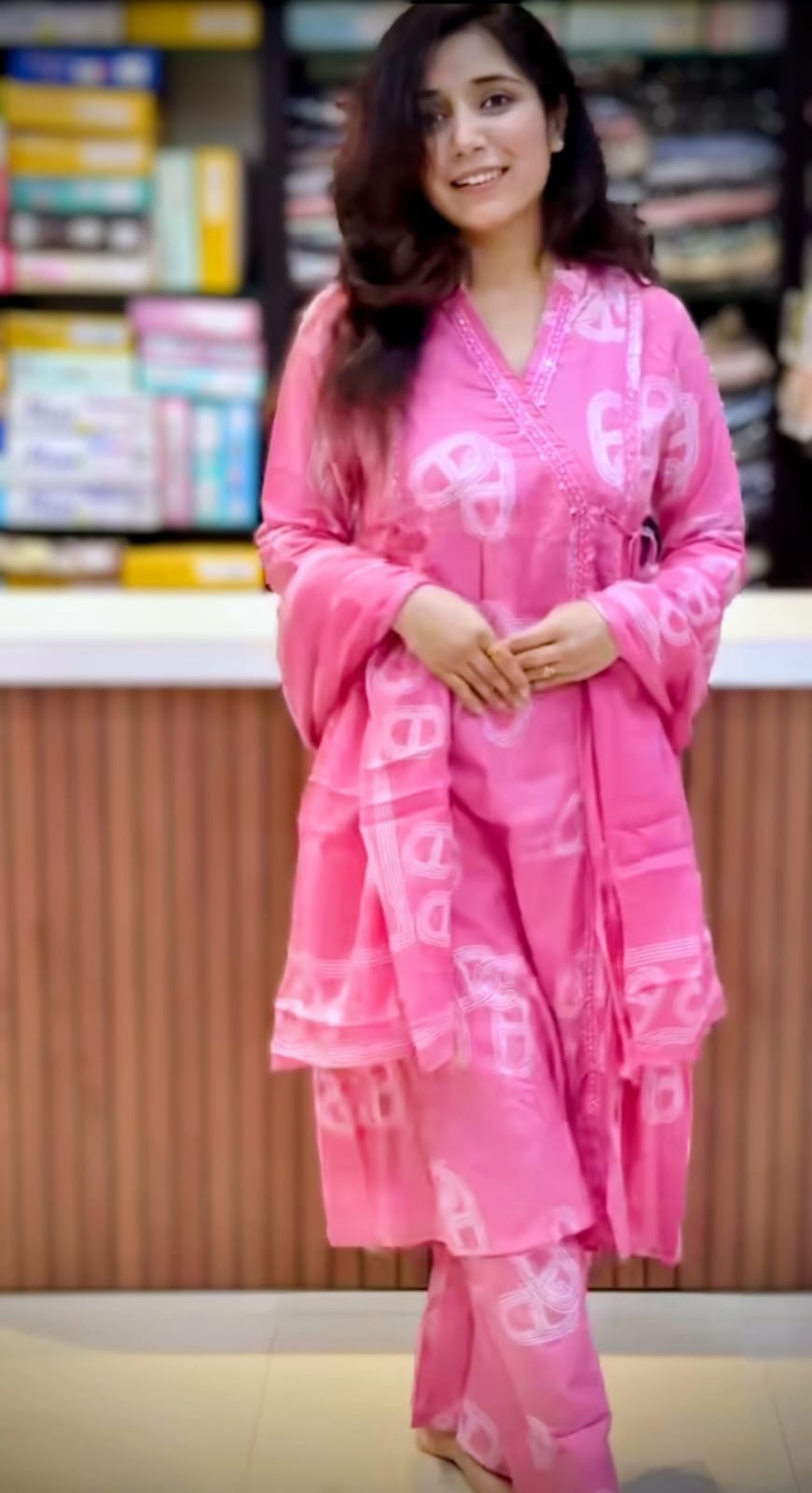 Modal is wearing a pink Angrakha-style kurta set. The outfit is a pure cotton, A-line suit with a block print design. It features a wrap-around front, which is a key characteristic of the Angrakha style.
