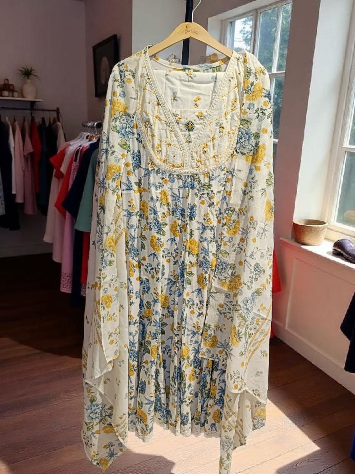 The dress shown in the image is a floral printed Anarkali suit. It is a type of Indian traditional attire that features a long, flared kurta often worn with matching pants and a dupatta .