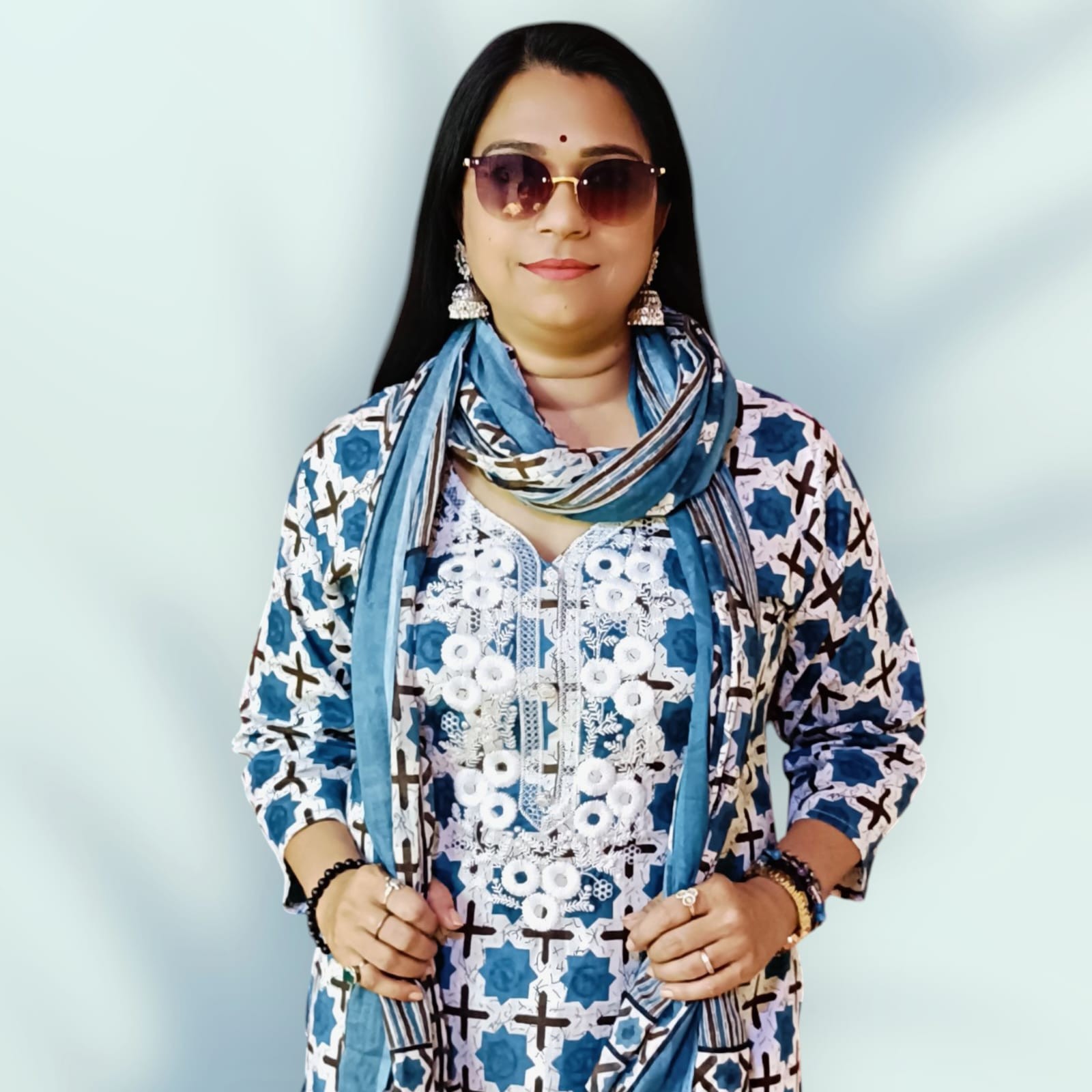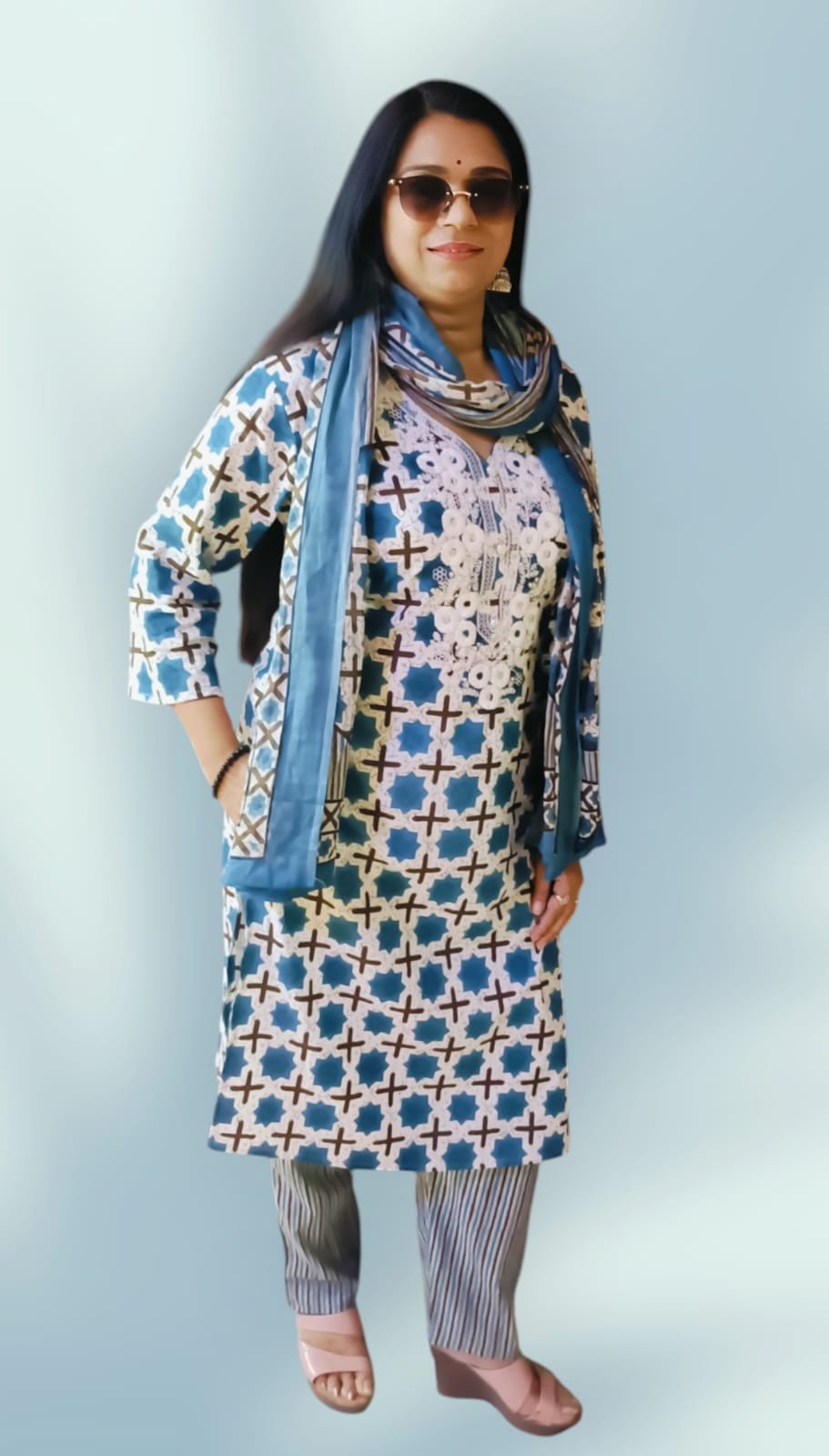 The kurti is typically made from cotton and features a blue and white ethnic print. It has an embroidered round neck and three-quarter sleeves. The set includes matching striped pants and a dupatta.