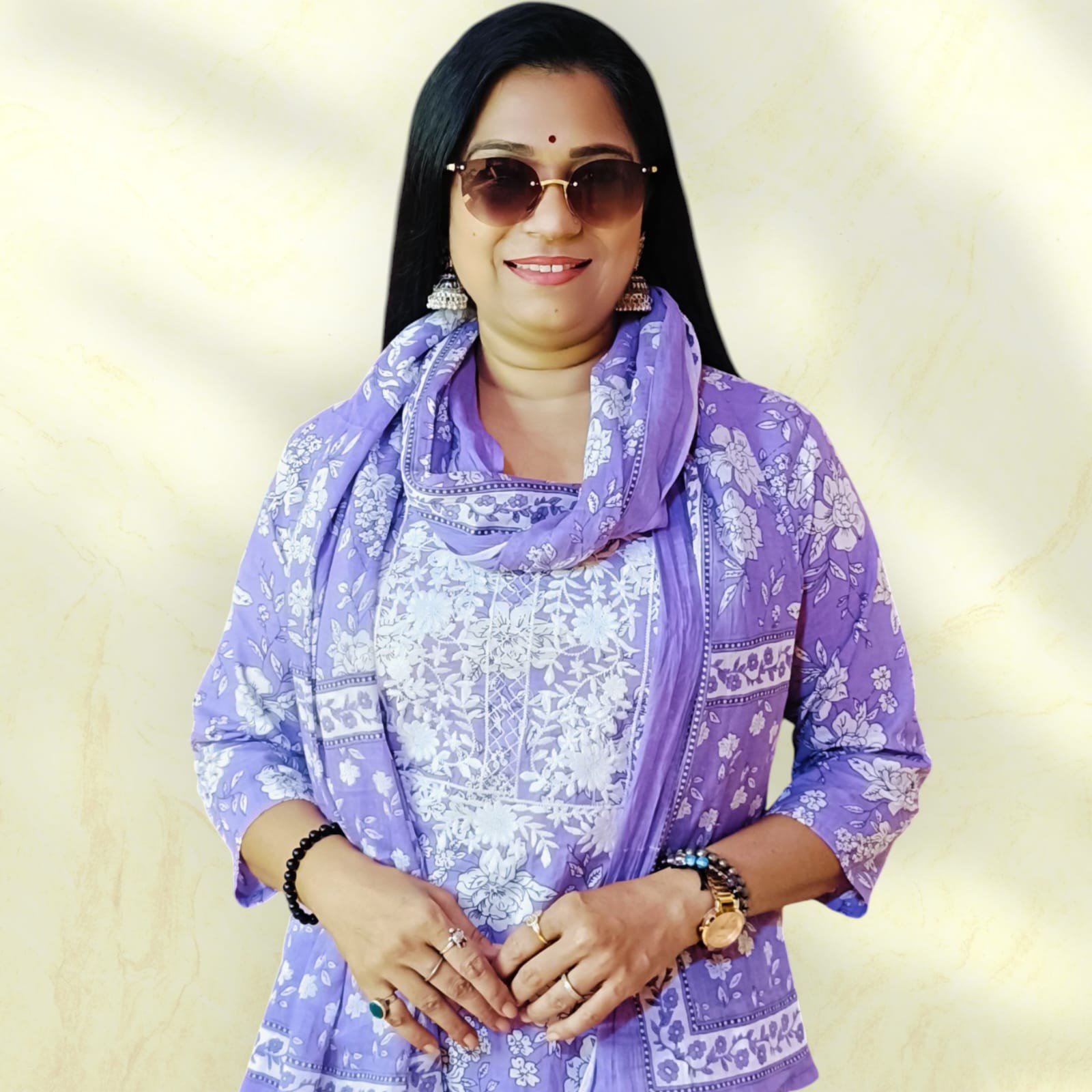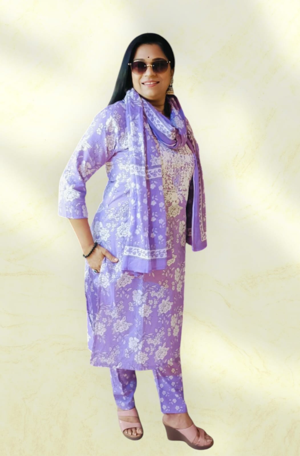 A lavender and white floral printed kurta set with a matching dupatta and pants is featured. This type of attire is a popular style of Indian ethnic wear
