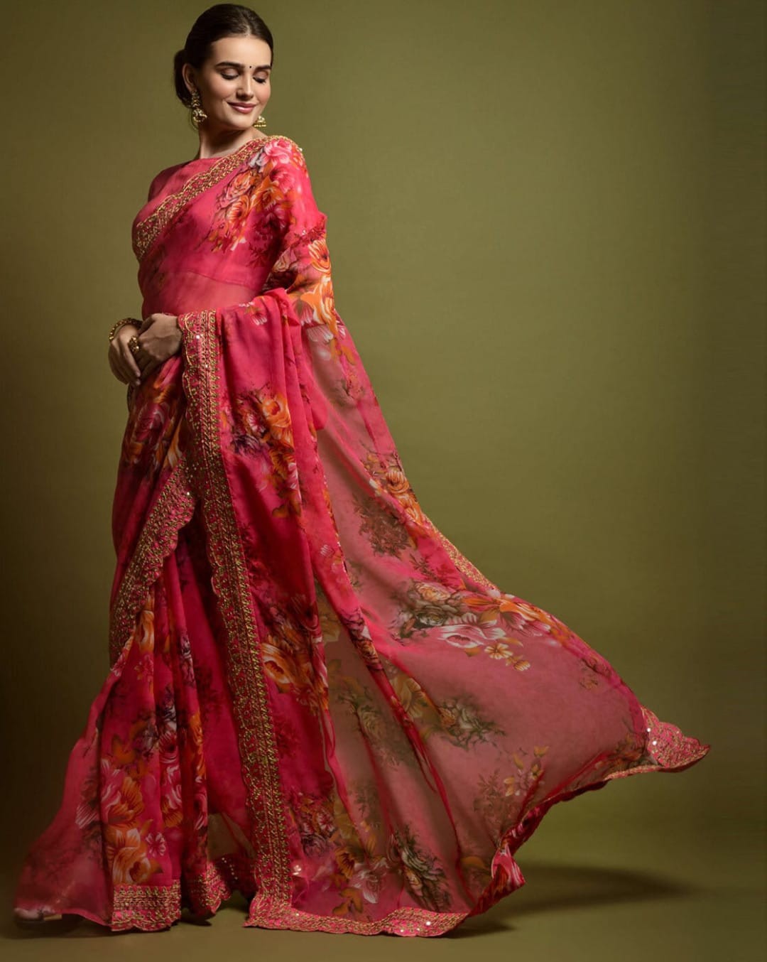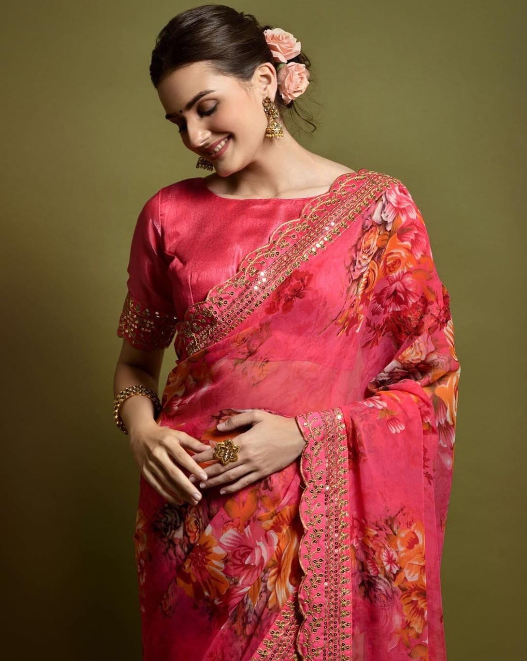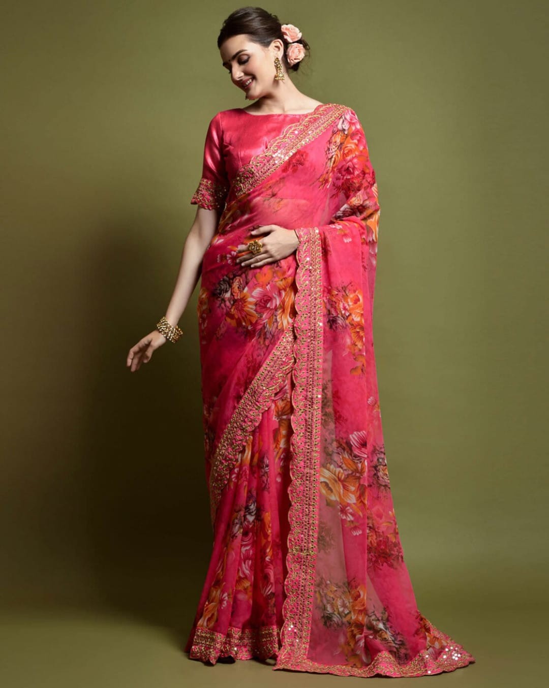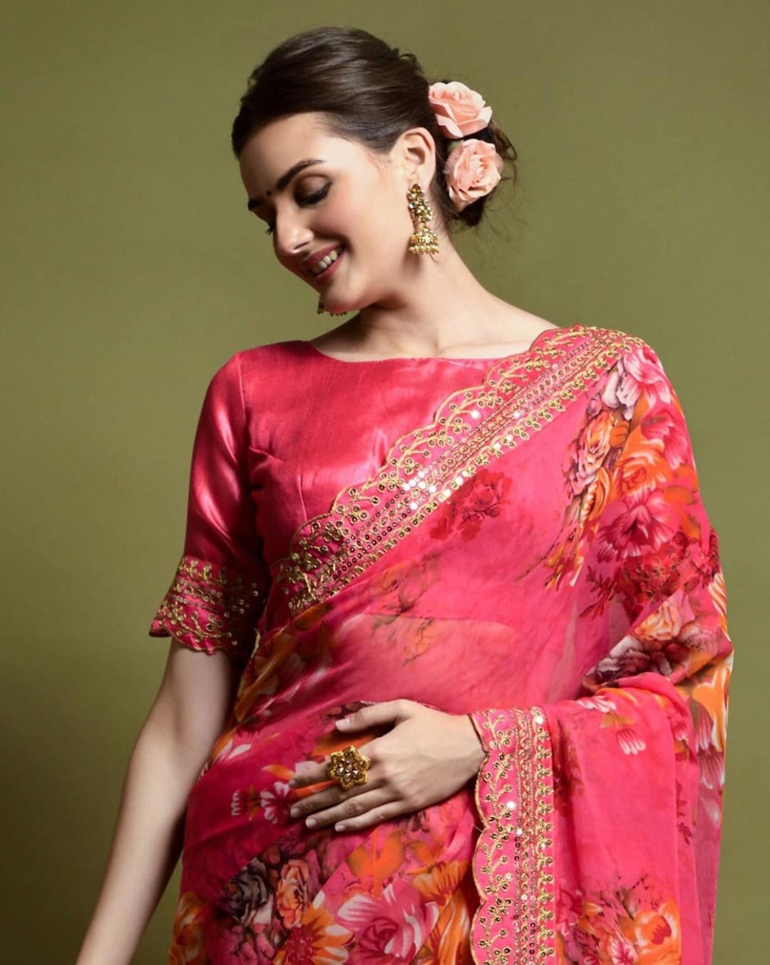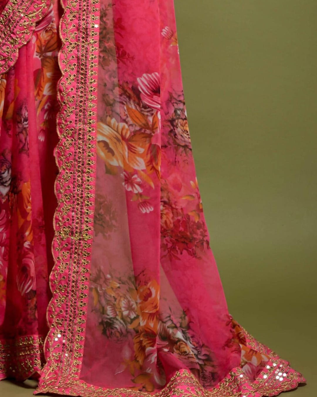 velley-jeni Designer rani pink color Fancy georgette saree with embellished sequins & floral print